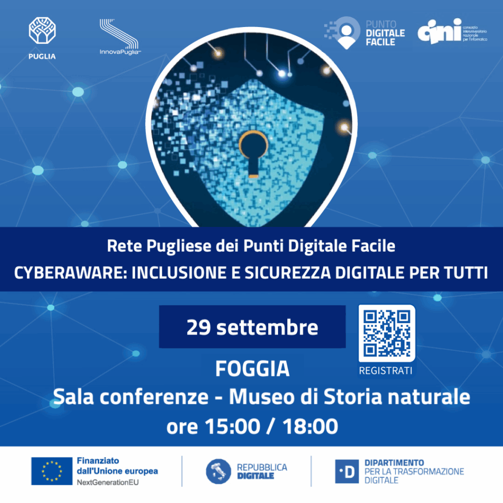 Prosegue il ciclo di incontri “CyberAware: Inclusione e Sicurezza Digitale per Tutti” con la quinta tappa a Foggia. “CyberAware: Inclusione e Sicurezza Digitale per Tutti” è un’iniziativa prevista nell’ambito del progetto “Rete dei servizi di facilitazione digitale” promosso dal Dipartimento Sviluppo Economico della Regione Puglia con la collaborazione di InnovaPuglia SpA, finanziato con le risorse del PNRR – Investimento 1.7.2, nell’ambito del progetto nazionale del Dipartimento per la Trasformazione Digitale (DTD).